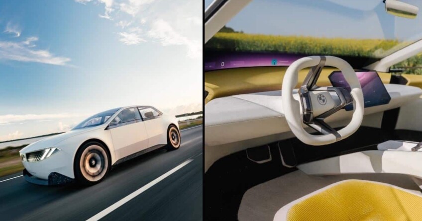 L’habitacle est composé de quatre sièges individuels et d’un volant qui n’est pas rond mais très aplati. BMW dit avoir renoncé au chrome et au cuir pour “optimiser l’empreinte carbone dans le processus de production”.